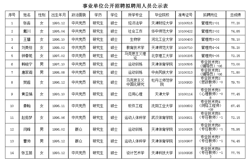 根据《天津市事业单位公开招聘人员实施办法(试行)》(津人社局发〔2011〕10号)文件精神,下列人员经笔试、面试、体检、考察等程序被确定为拟聘人员,现予公示。